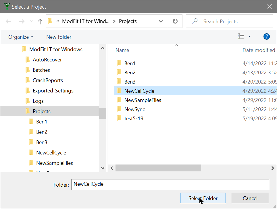 A project is a folder on disk, usually located in the ModFit LT\Projects folder under the user's Documents. Find the project folder you want to open, select it in the list, then click the Select Folder button to open the project.