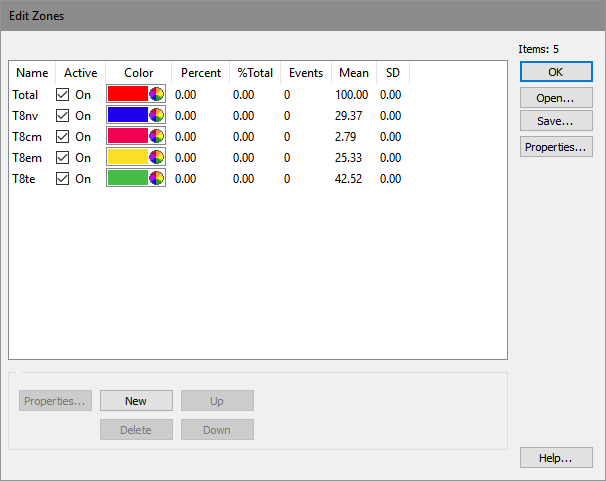 Each stage has a name and color. The color is used when drawing dots that fall within the stage's boundaries and along the top of Overlay plots when stages are displayed. If overlapping stages are defined, the color of the last stage containing an event is used to color dots for that event.