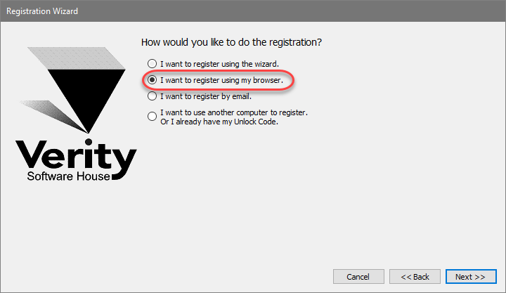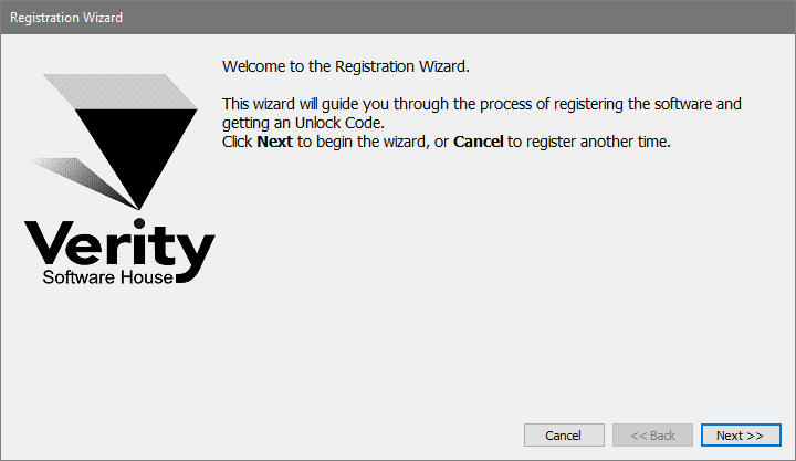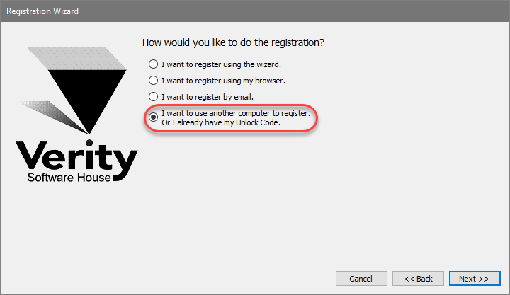 If you do not have access to the Internet, you can send the registration information below to Verity Software House by fax, mail, or telephone. Our technical support staff can register the software for you with the information you provide, and supply you with the Unlock Code to enter into the Registration Wizard.