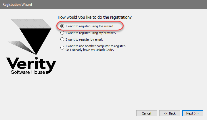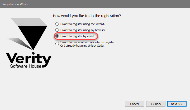 The registration wizard can help you send email to Verity Software House with your registration information. Choose the third option in the list and click Next to create an email message.
