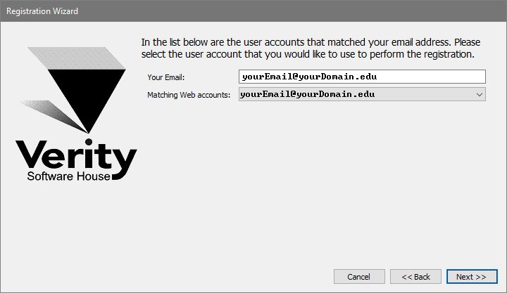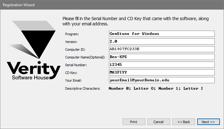 The Serial number and CD Key can be found on the outside of the program box or in email if the program was provided to you by download. Enter these exactly as they appear; they are case-sensitive. If you have lost or misplaced the Serial number or CD Key, contact Verity technical support at tech@vsh.com or (207) 729 6767.