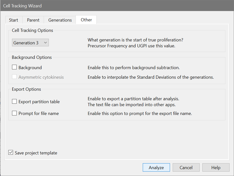 The Cell Tracking Options group allows you to identify the generation that is considered the start of true proliferation. This value is used in computing the Precursor Frequency and the Upper Generation Proliferation Index (UGPI). For a description of the use of Precursor Frequency, see "A flow cytometric method to estimate the precursor frequencies of cells proliferating in response to specific antigens", Givan, A., et al, Journal Of Immunological Methods Vol. 230, 1999 Elsevier Science B.V.