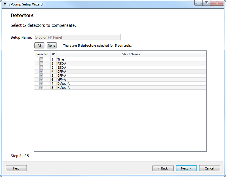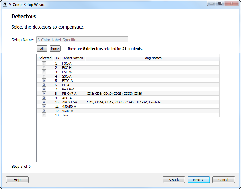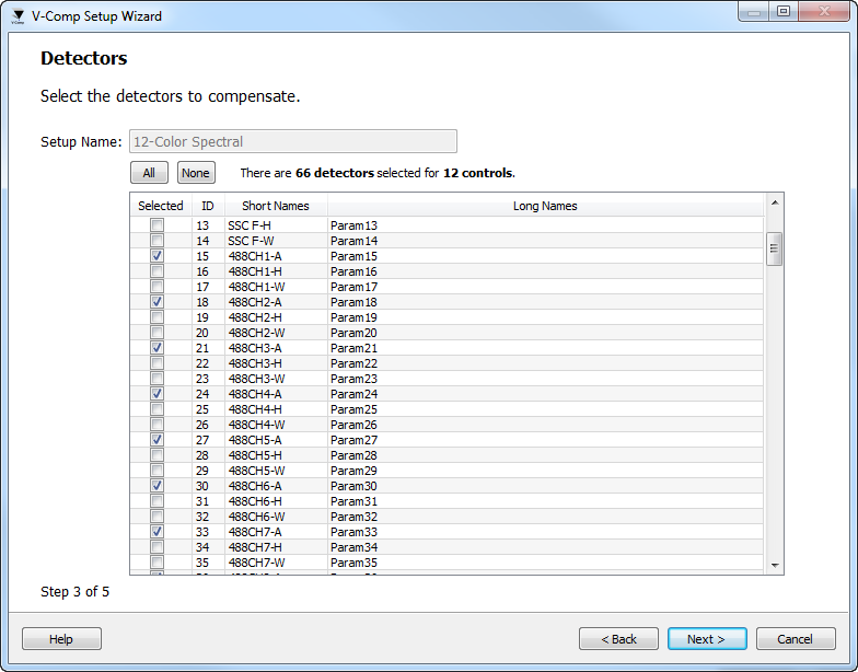 For Spectral setups, choose at least as many detectors as you have single-color controls. With spectral cytometers, the detectors represent a portion of the wavelength spectrum and there are typically more detectors than single-color controls. The program can "unmix" spectral data using special features in the V-Comp™ compensation logic.