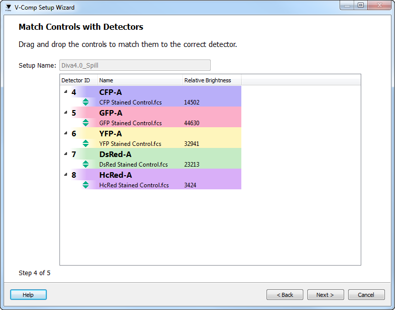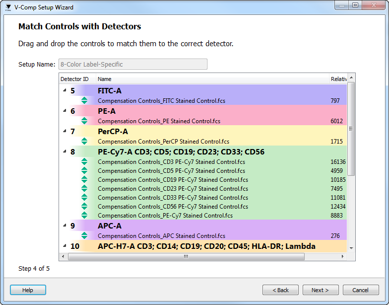 The wizard will automatically associate a single-color control with a detector based on the intensity of the events in the control file. In most cases, this will associate the correct control with each detector. Always review the list carefully to ensure the correct detector-control matches, and make corrections as needed.