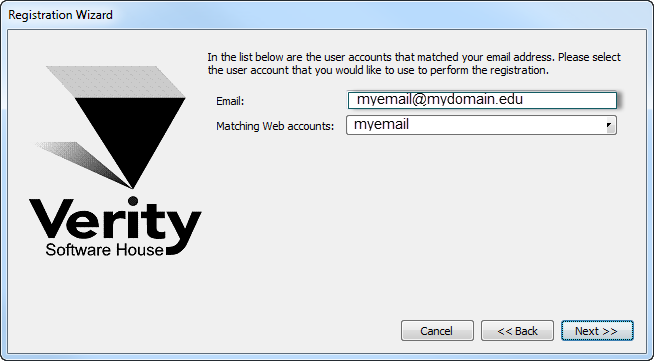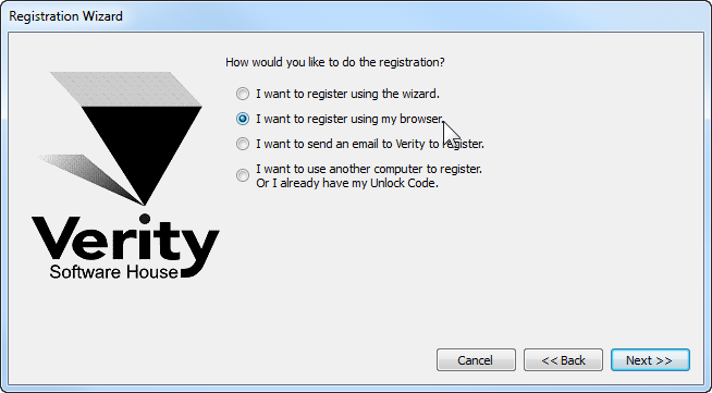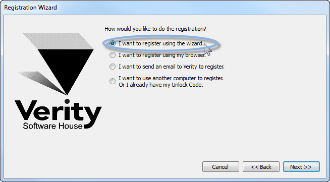 The registration wizard can help you send email to Verity Software House with your registration information. Choose the third option in the list and click Next to create an email message.