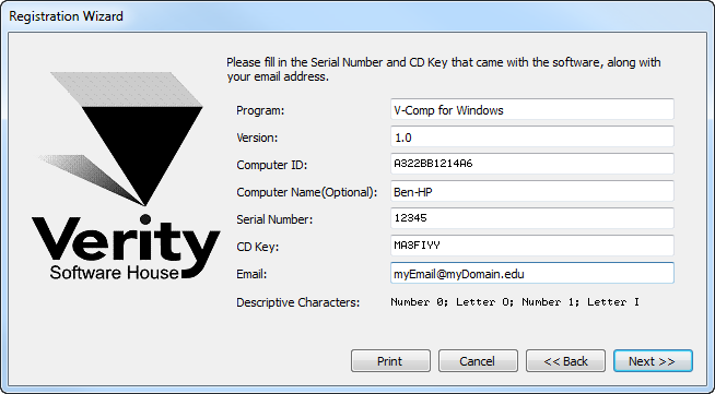 The Serial number and CD Key can be found on the outside of the box the program came in, or in email if the program was provided to you by download. Enter these exactly as they appear; they are case-sensitive. If you have lost or misplaced the Serial number or CD Key, contact Verity technical support at tech@vsh.com or (207) 729 6767.