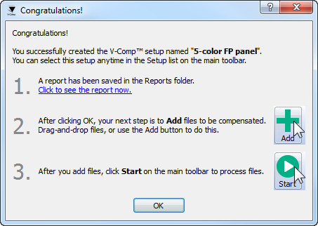 After the wizard creates the new setup, the Congratulations dialog is displayed. This dialog allows you to view the report of the V-Comp™ setup, and explains what the next steps are.