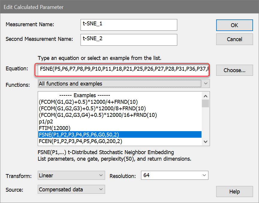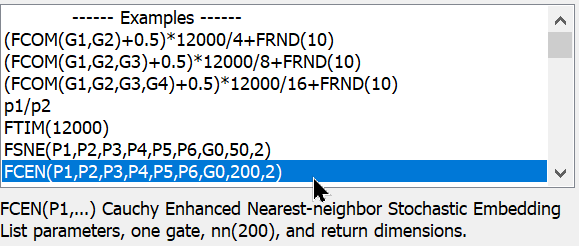 Let's choose an example equation from the Functions list box. The function we're looking for is actually FSNE as opposed to t-SNE. All WinList function names start with the letter F and have a total of 4 letters, so t-SNE becomes FSNE.