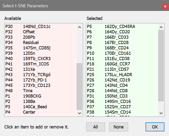 The Select t-SNE Parameters dialog is displayed, showing two lists of parameters. The Available list on the left contains parameters we have not included, and the Selected list on the right contains those that we have added. To move an item from one list to the other, you simply click the item.