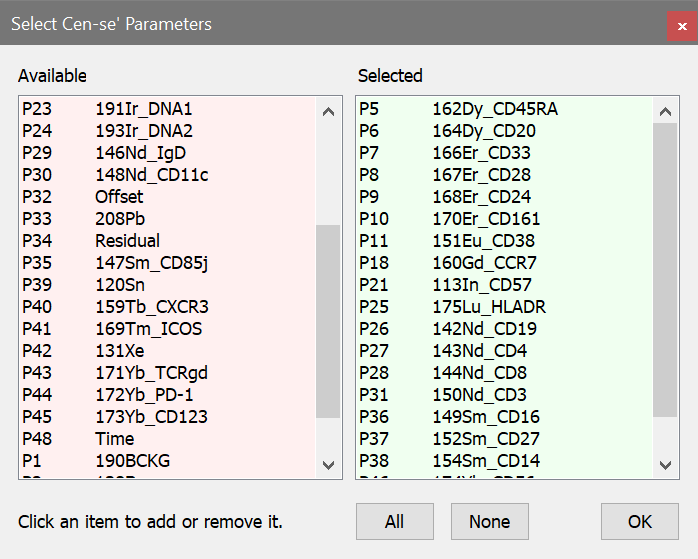 WinList has integrated t-SNE and Cen-se' algorithms as calculated parameters, making it easy to generate these plots and explore your data. Let's take a look at how to do this with an example file acquired on a Fluidigm Helios instrument with 48 measurements.