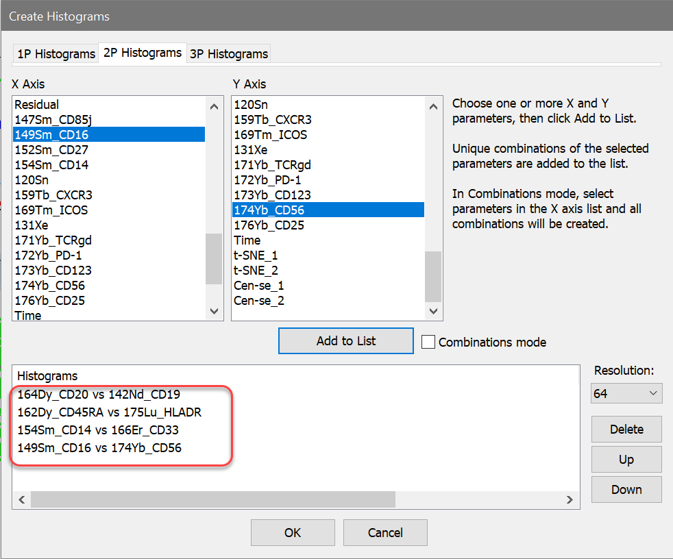 26. On the Insert tab of the ribbon, click the Multiple button to display the Create Histograms dialog. Add 2P histograms for these markers: