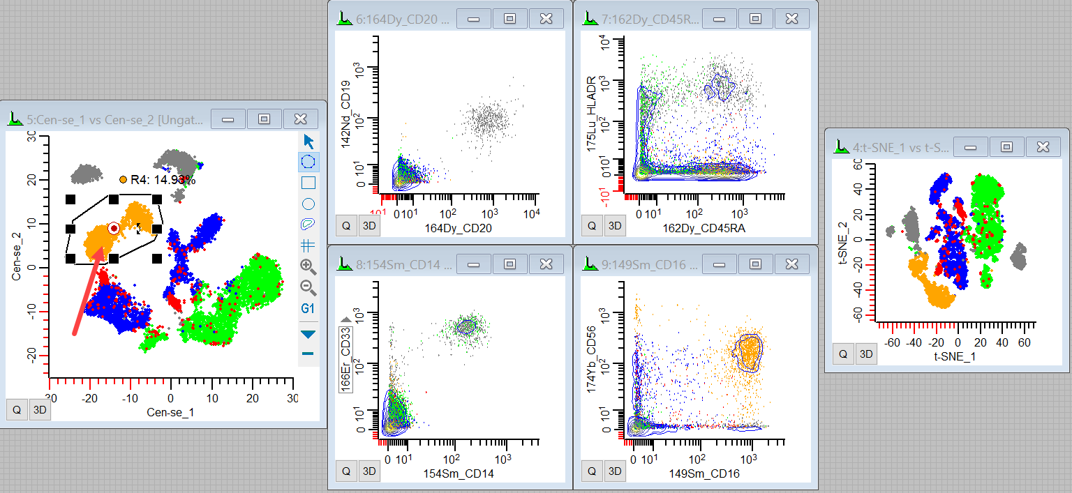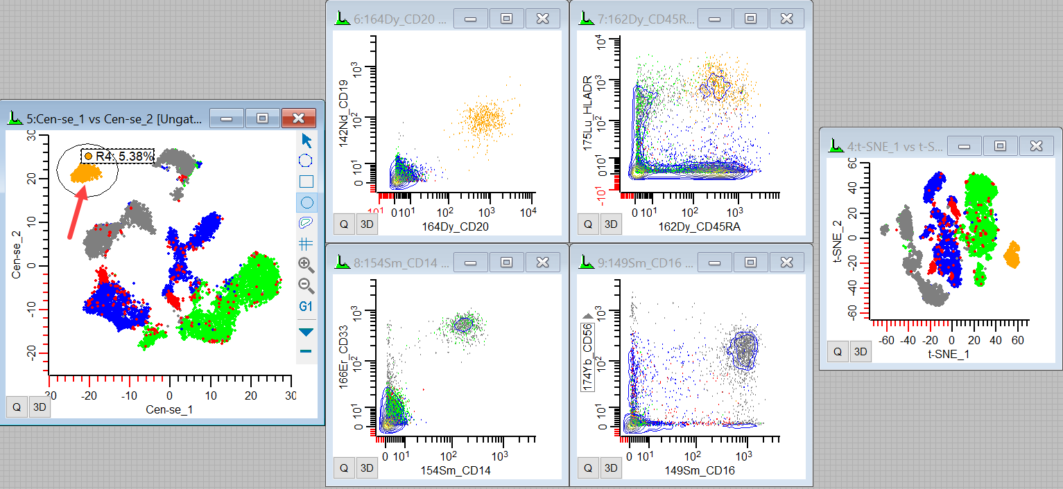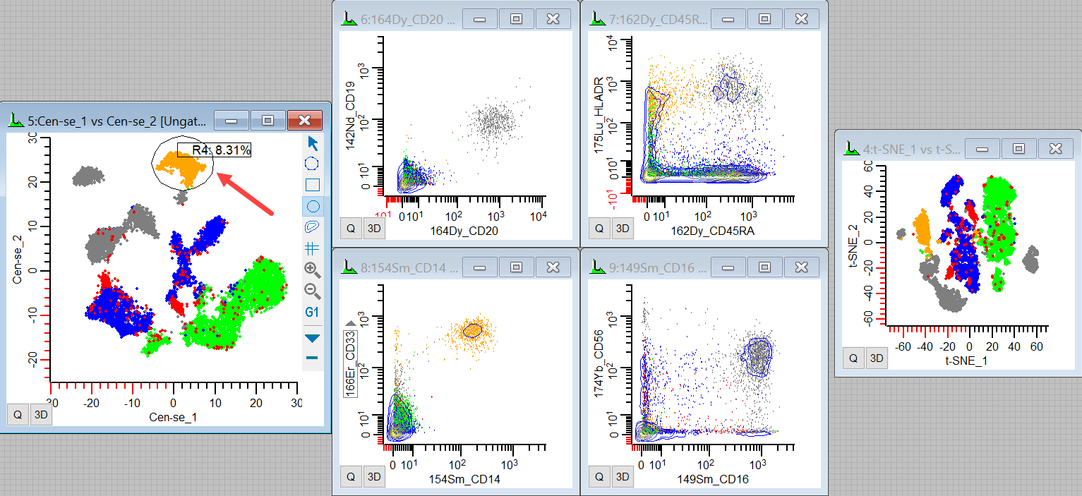 So we can see event coloring and gating in t-SNE and Cen-se' and figure out what the different populations relate to. Since these plots can change shape and location from file to file, this is always a good way to get started. It provides a backbone of information to help relate the plots to what we know about our data.
