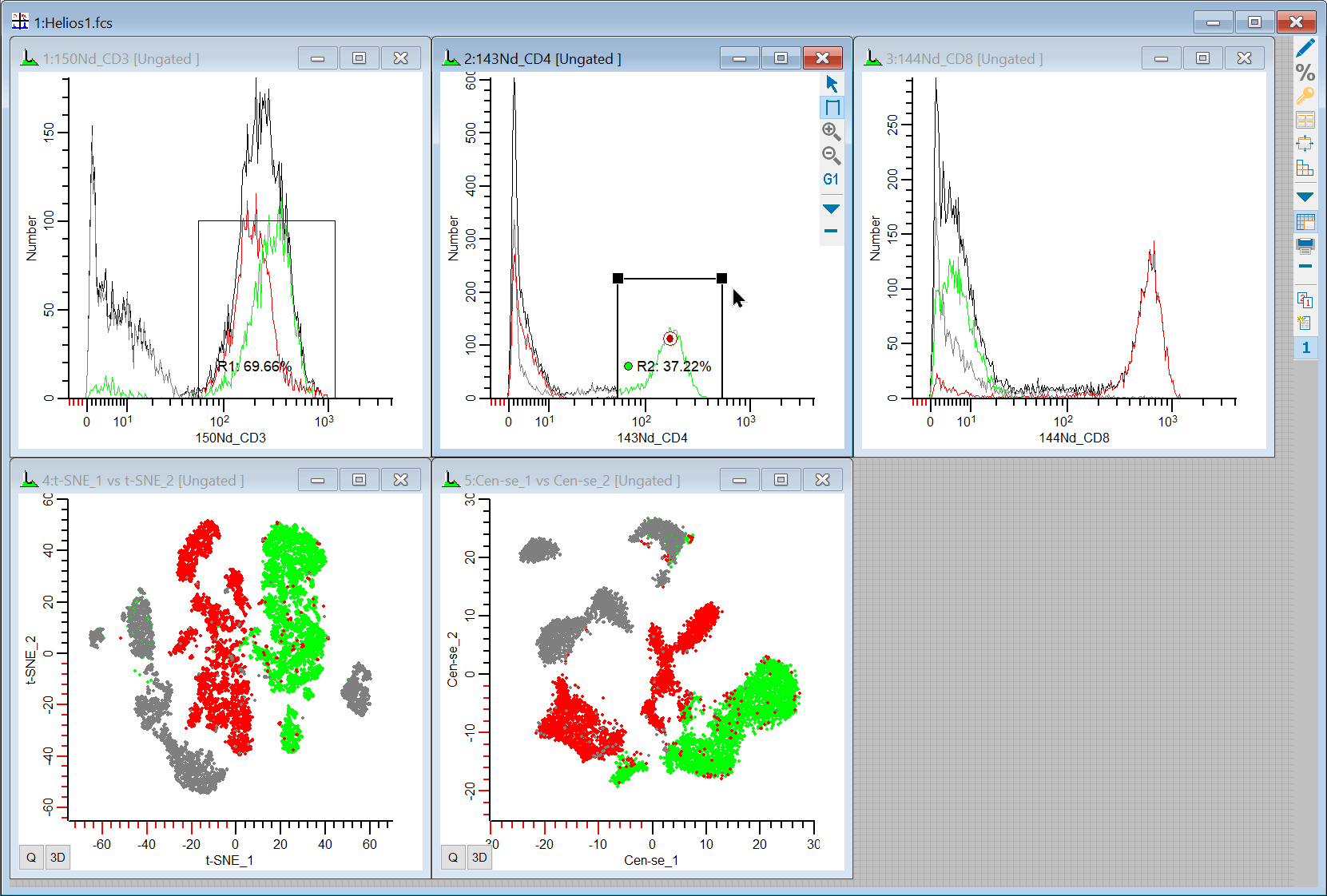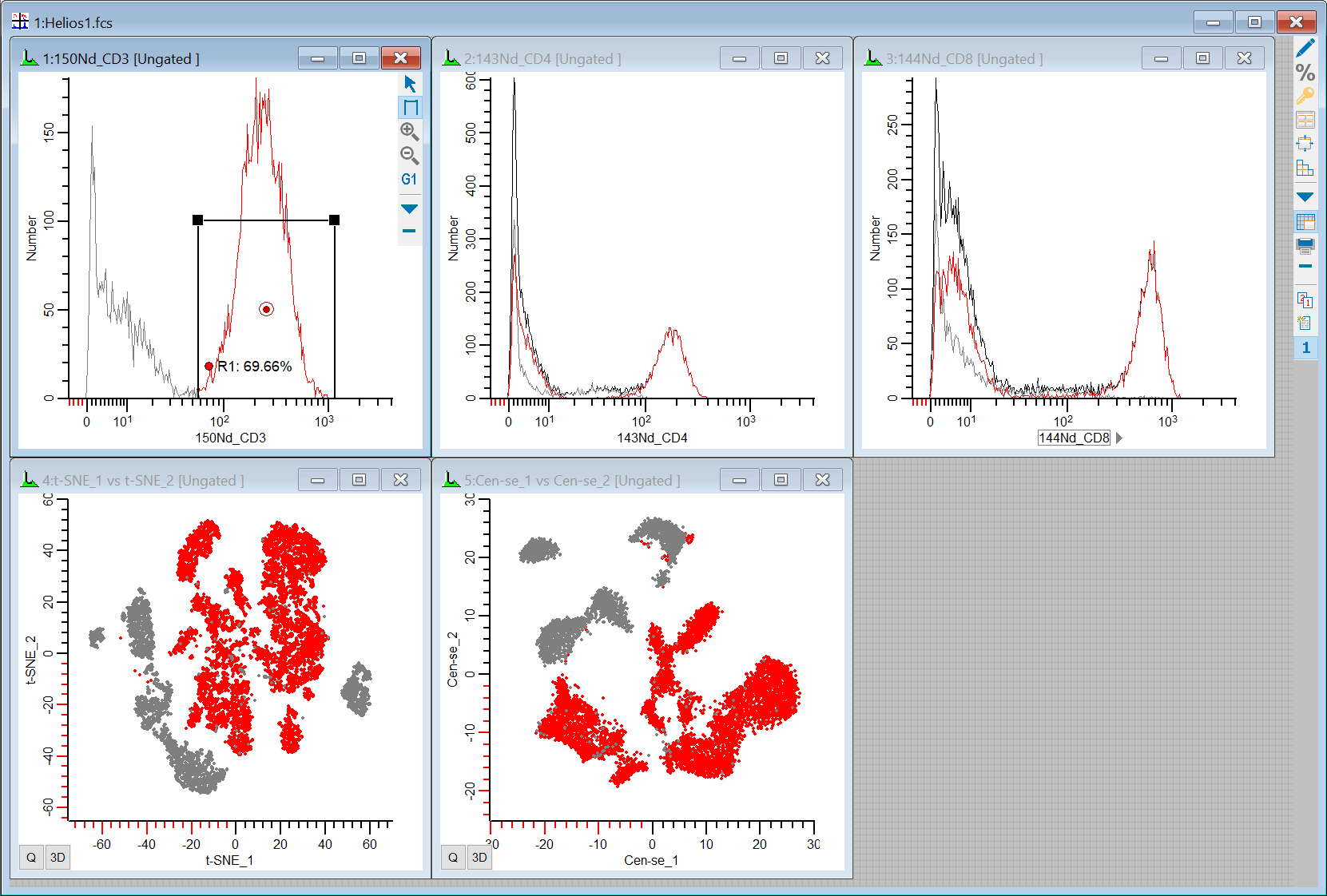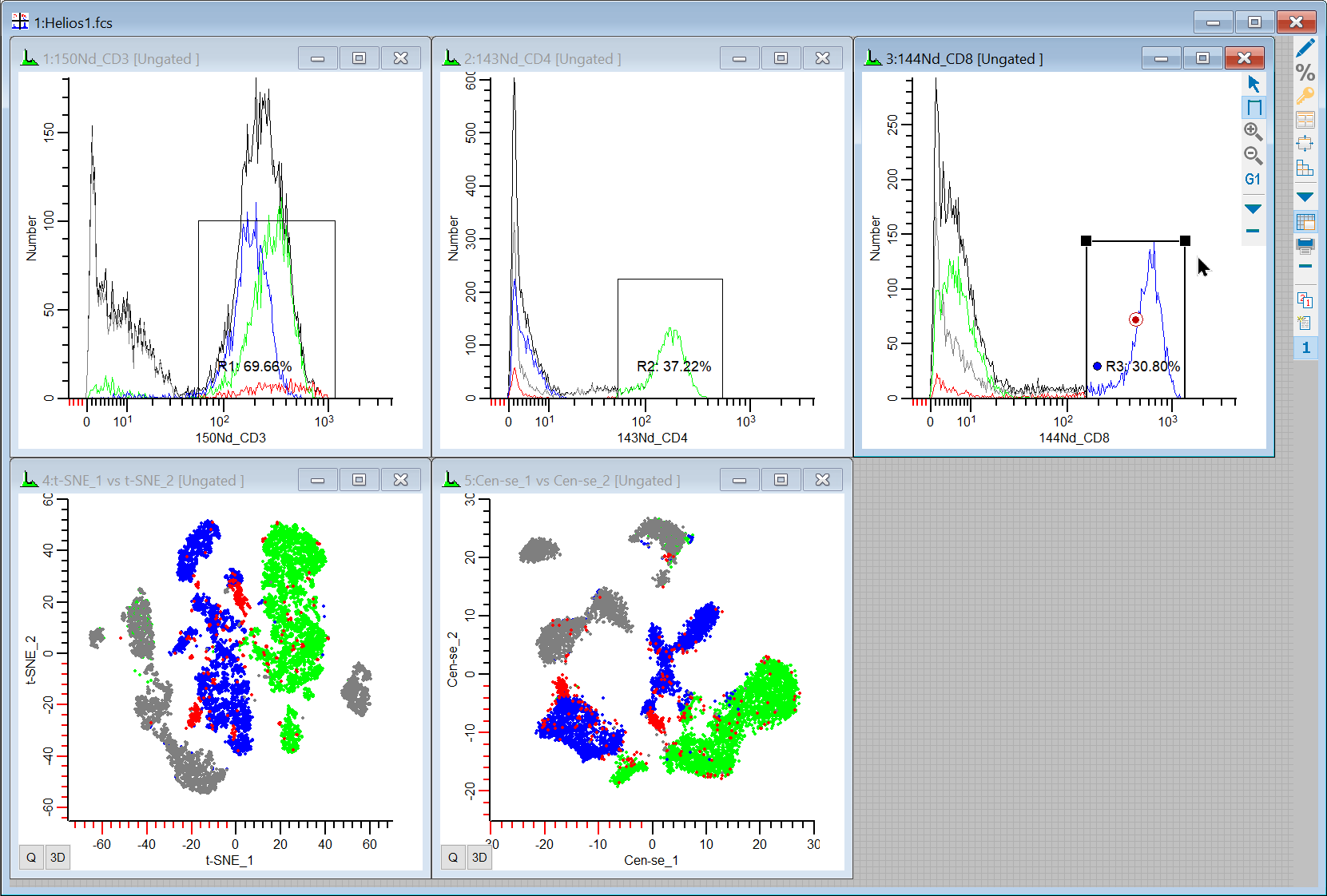Our workspace has 5 plots on it: 1P plots for CD3, CD4, and CD8, and 2P plots for t-SNE and Cen-se'. Let's put some regions on the 1P plots to see where the positives are the 2P plots.