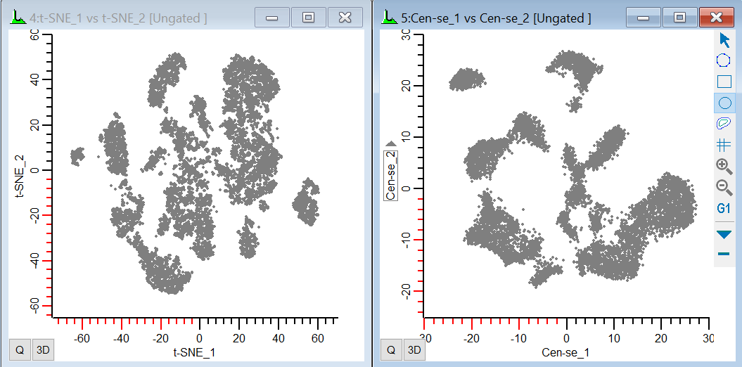 WinList includes powerful Cen-se and t-SNE functions that take high-dimensional data and flattens it into 2-dimensional space so that it can be visualized in conventional 2P plots. Cen-se' is computed using the FCEN calculated parameter, and FSNE is WinList's implementation of t-SNE. You can display the measurements created by the functions as 2P plots that work just like any other 2P plots.