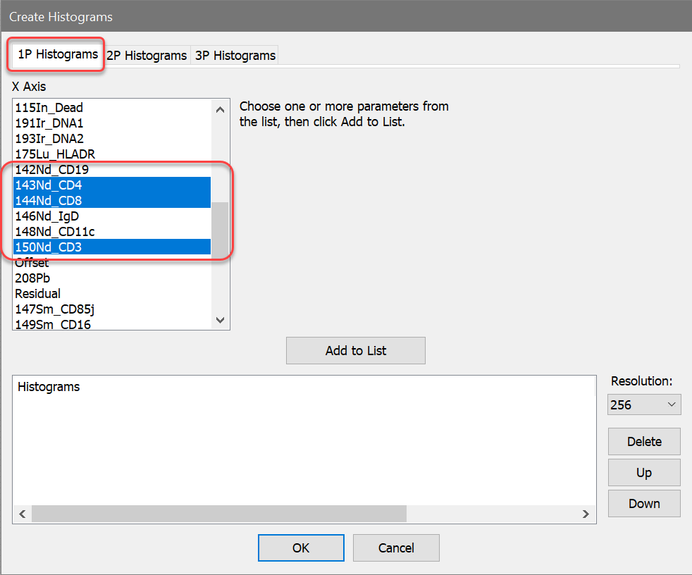 2. In the Create Histograms dialog, switch to the 1P Histograms tab and select the CD4, CD8, and CD3 measurements. The full names for these are 143Nd_CD4, 144Nd_CD8, and 150Nd_CD3. With these selected, click OK.