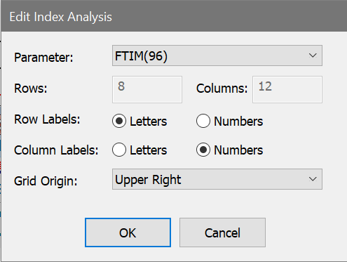 Choose the parameter in the FCS file that you want to display in the Index Analysis window. It is best if this parameter contains index-like information - whole numbers in the range defined by the number of rows and columns.