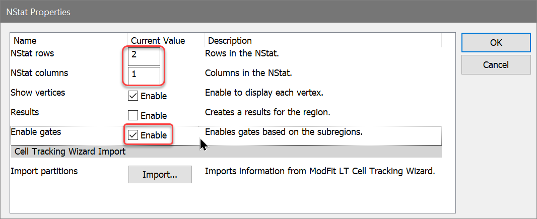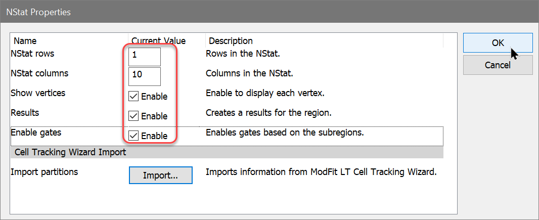 16. Edit the NStat rows to 1 and check the Show Vertices, Results, and Enable gates checkboxes. The number of columns should already be 10 from the Import. Click OK.