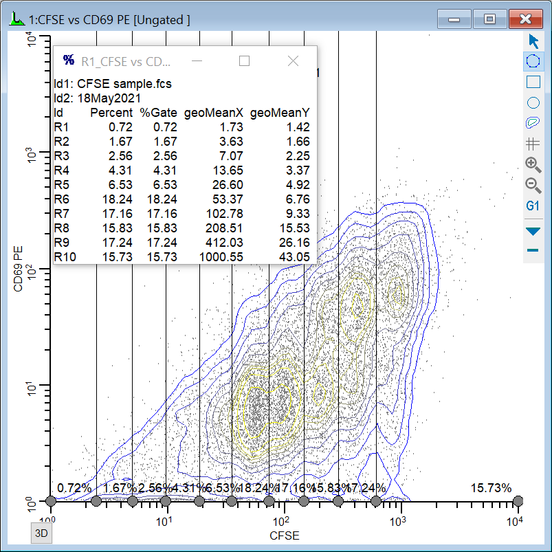 Now, one of the histograms contains an NStat that shows the proliferation partitions, and the other histogram has an NStat that will allow us to define the CD69 negatives and positives.