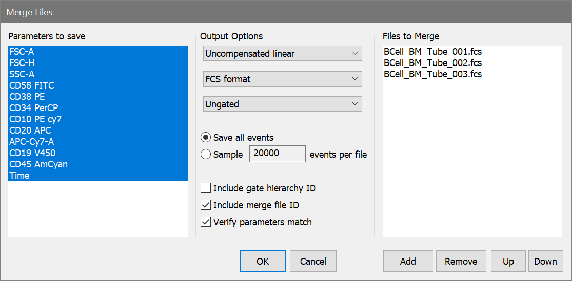 Use this command to create a new listmode file that is a concatenation of a set of FCS files. A gate can be applied to restrict the events in the exported data file. You can save original parameters as well as calculated parameters, either compensated or uncompensated. Output formats include FCS or text file format.