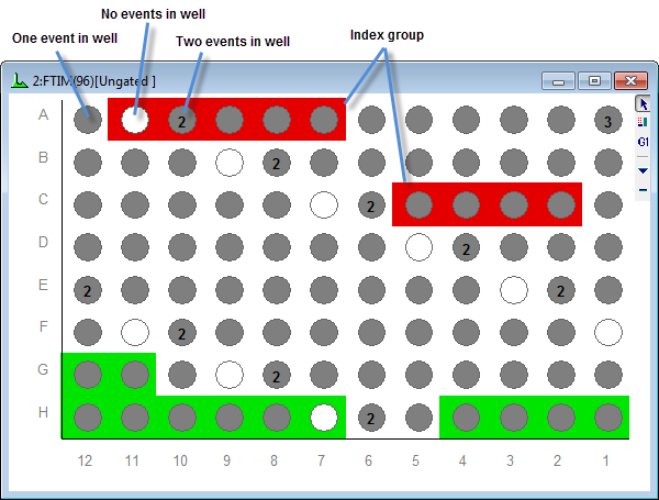 The Index Analysis window is a special display for parameters that contain index-like data. Some plate-sorting cytometers create index parameters that indicate which well on the sort plate each event went into. The Index Analysis window is a great tool for viewing and investigating that information.