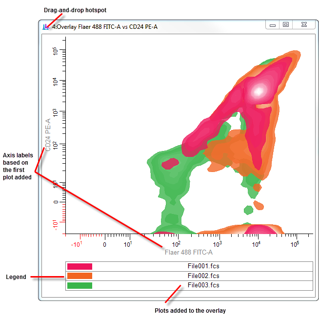To add a plot to an overlay, drag a histogram by the icon on the left side of its toolbar and drop it onto the overlay. The first plot that is added to an overlay determines whether it is a 1P or 2P overlay window. It also determines the axes that will be displayed. If you subsequently add a plot with different parameters than the first plot, the overlay will ask if you really intend to do so.