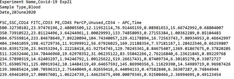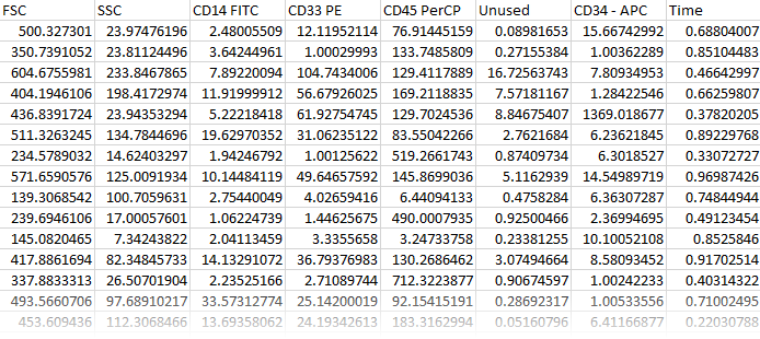 During this pass, the logic is also looking for a line that contains the names of the measurements - a header row. For example, "FSC,SSC,CD14 FITC,CD33 PE,CD45 PerCP,Unused,CD34 - APC,Time" on a line would be interpreted as defining the names for 8 measurements.