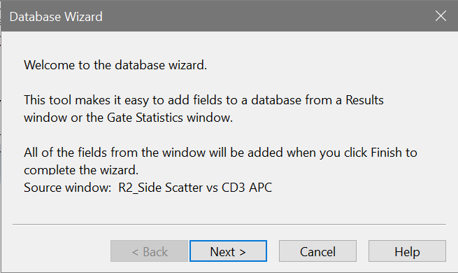 To use the command, first activate a Results window or Gate Statistics window by clicking its title bar. Then, right-click the window to display its context menu and choose Database Wizard. A wizard dialog appears.