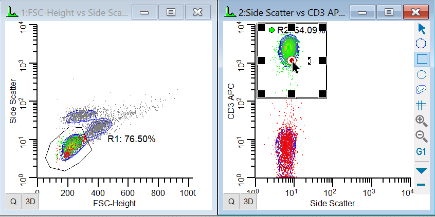 7. Draw region R2 around the CD3-positive population in the new histogram. Click on the cascade hotspot for R2, move the mouse onto the data source window, and draw a third histogram.