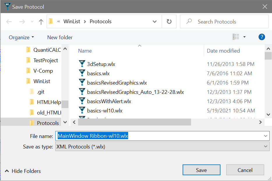 This command displays the Save dialog box. Enter a name for the protocol, navigate to the folder where you want to save the protocol, and click the Save button.