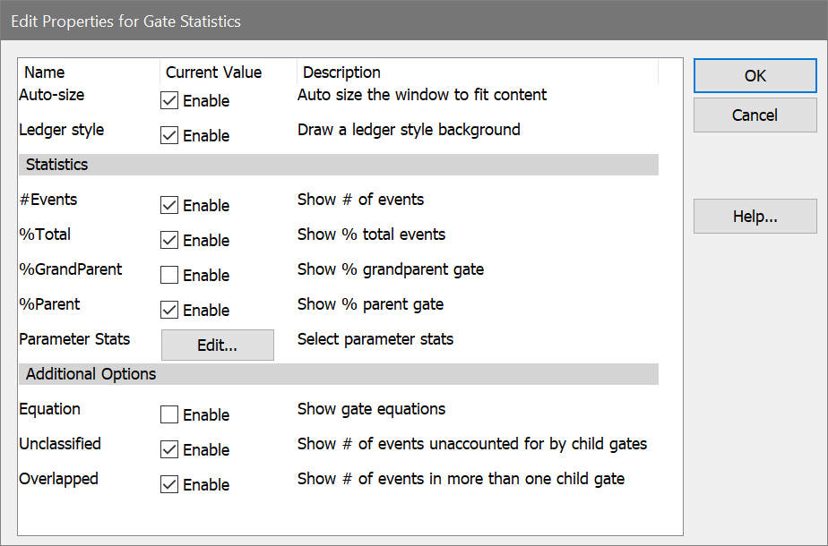 This button displays the Edit Parameter Stats dialog, which allows selection of parameters statistics to be computed for each gate.