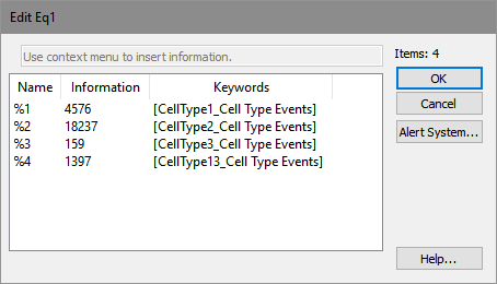This dialog is used to edit the placeholders in an equation. Placeholders are the parts of the equation format that use the percent symbol (%) and a number. Each placeholder must be associated with a piece of information, which is used when the equation is evaluated.