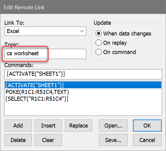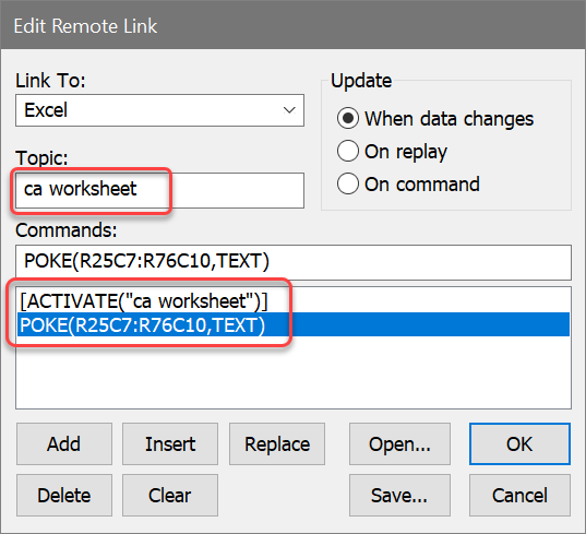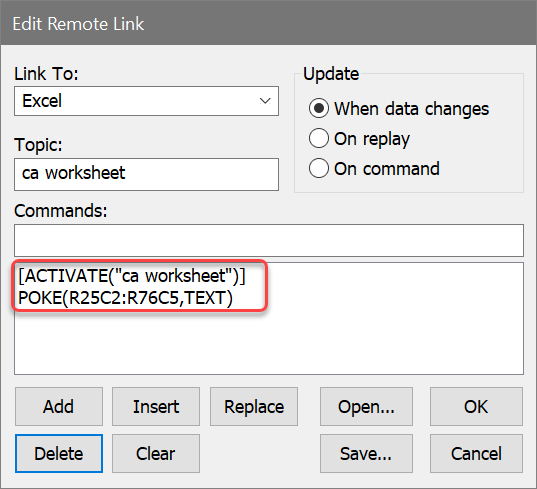 25. Select the second command in the Commands list, edit the text to "POKE(R25C2:R76C5,TEXT)", and then click the Replace button. This tells Excel where to put the results data that WinList will send to it.