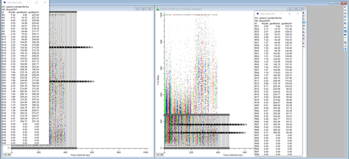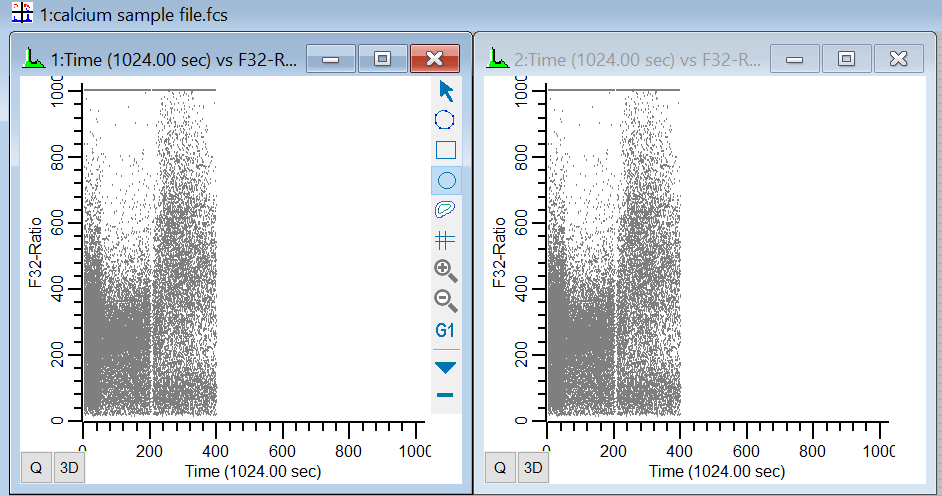 7. Select Time in the X Axis list, F32-Ratio in the Y Axis list, and then click Add to List two times. You should see two entries in the Added Histograms list. Click OK to close the dialog and display the histograms.