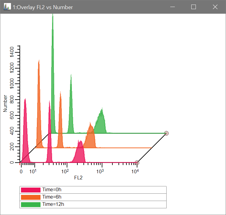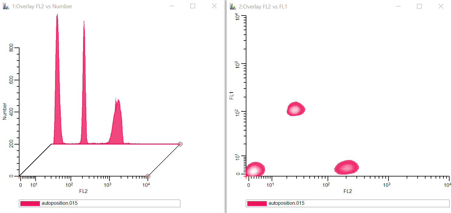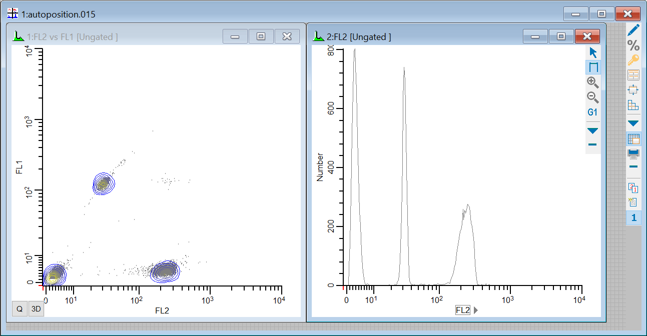 We're going to look at a series of samples in which the intensity of the marker in FL2 diminishes, and we will overlay the graphics to compare the changes. Let's create two overlay windows, one for the 1P graphics and the other for 2P graphics.