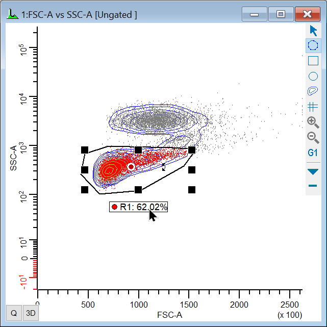 6. Click the title bar of the FSC-A vs. SSC-A histogram and select the Freehand region tool from the toolbar on the right side of the window.
